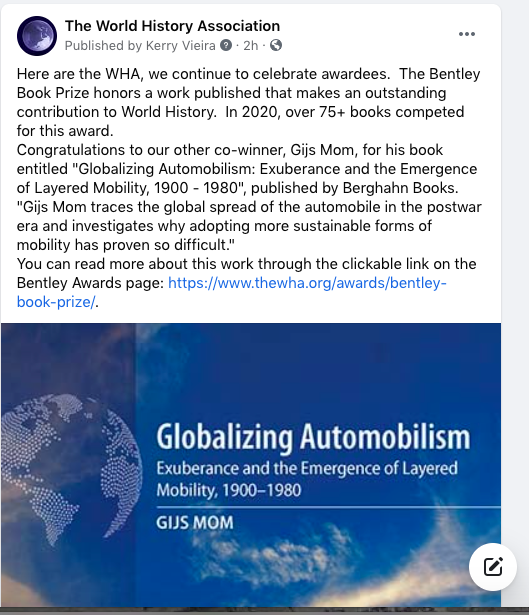 We are very proud to announce that Gijs Mom (formerly EHL professor, now retired) has won the 2021 Book prize of the World History Association for his book